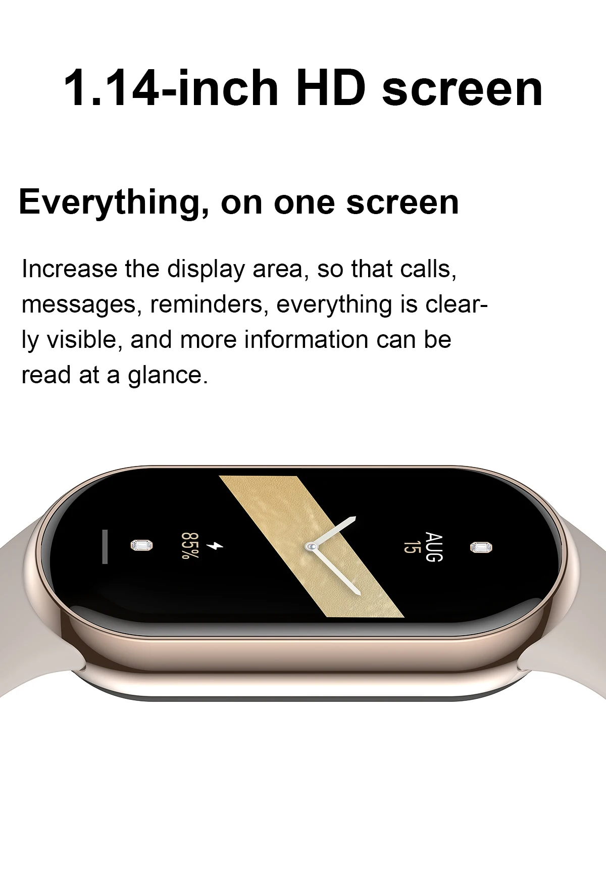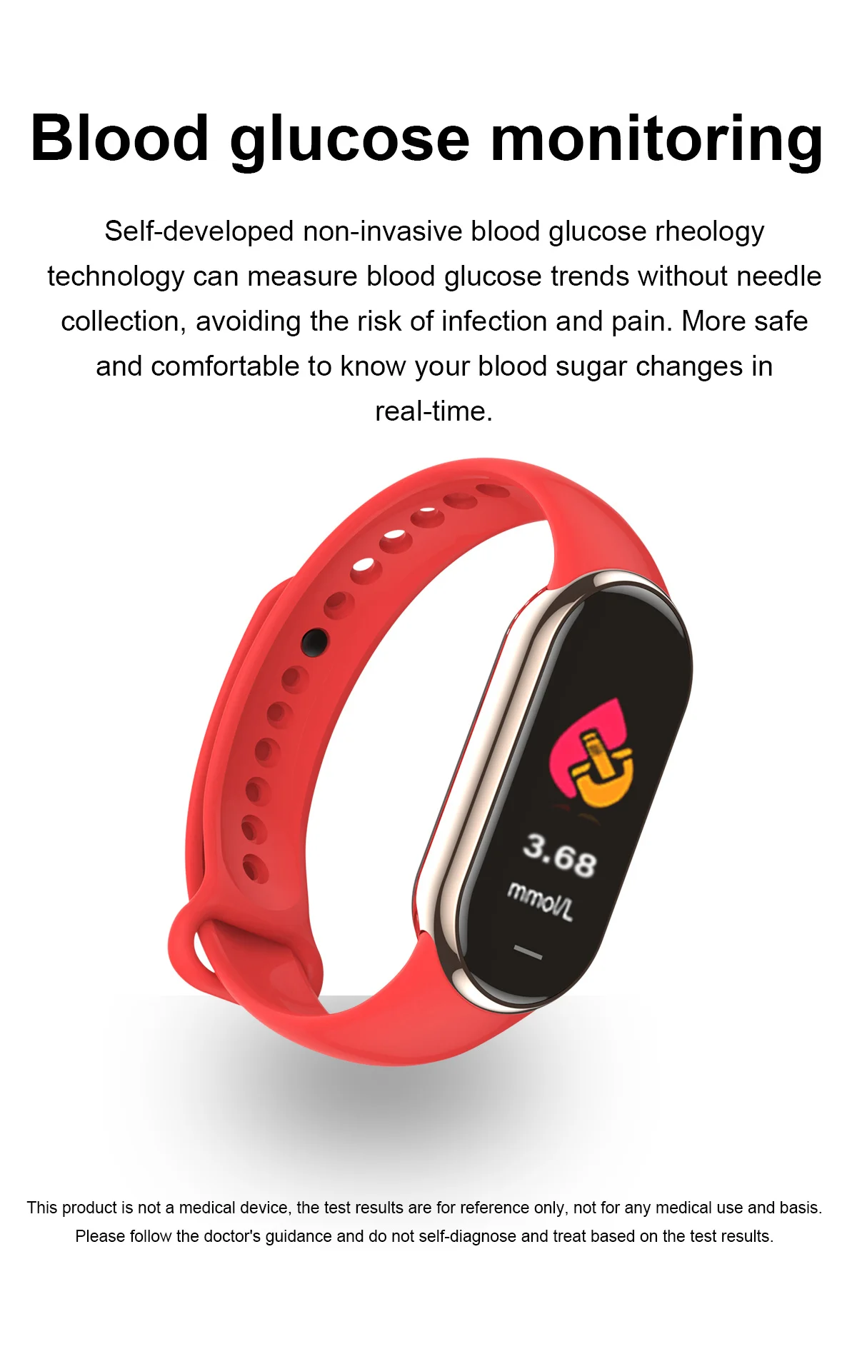1.14-inch HD screen, glucose measurement, heart rate monitoring, blood pressure monitoring, sleep monitoring, sedentary reminder, capacitive touch buttons, incoming call and message reminders, smart alarm clock, paearofero,shake to take a picture, remote care function for friends and family, hand-raising brightening screen.